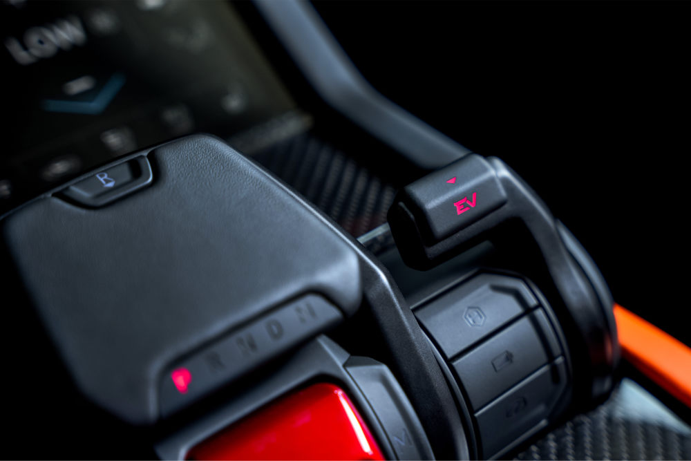 In the center of the console, the “tamburo” selector unit is used for choosing the different driving modes. Thanks to the introduction of the hybrid powertrain, the six Urus driving modes are combined with four new Electric Performance Strategies (EPS), for a total of eleven options. The Strada, Sport, and Corsa modes (for road and track use), and the Neve, Sabbia, and Terra modes (for surfaces with a different grip than asphalt) are now accompanied by the EV Drive, Hybrid, Performance, and Recharge options.
