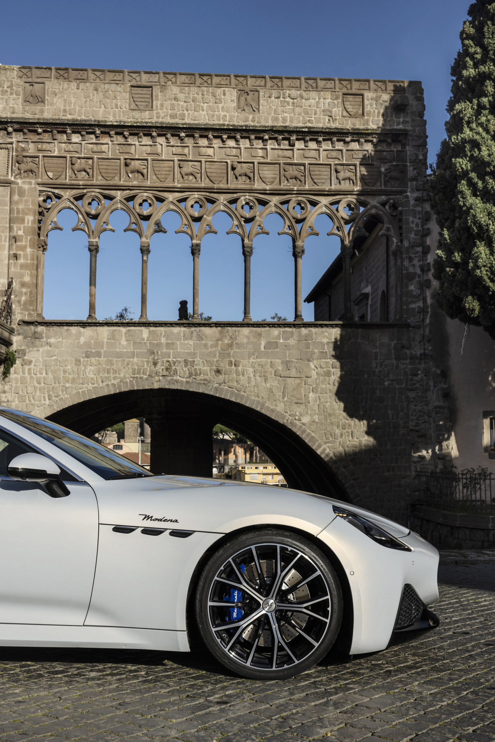 The classic proportions of the brand’s cars have been maintained, with the long bonnet and the central body intersected by the four fenders. Conversely, the roof line drops dynamically to emphasise the curve of the pillar that features the iconic Trident logo.