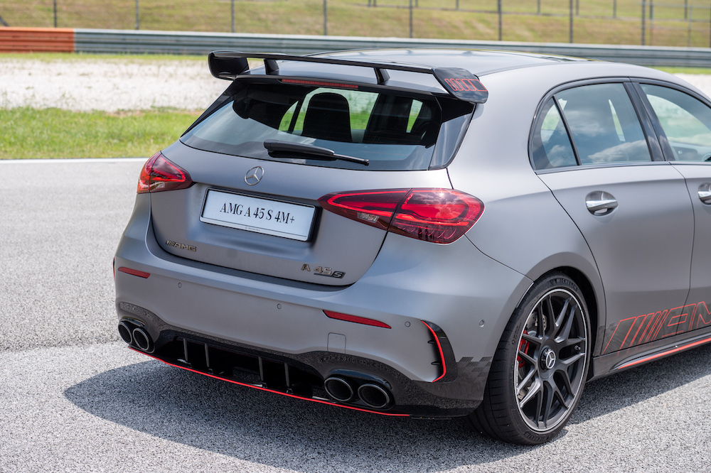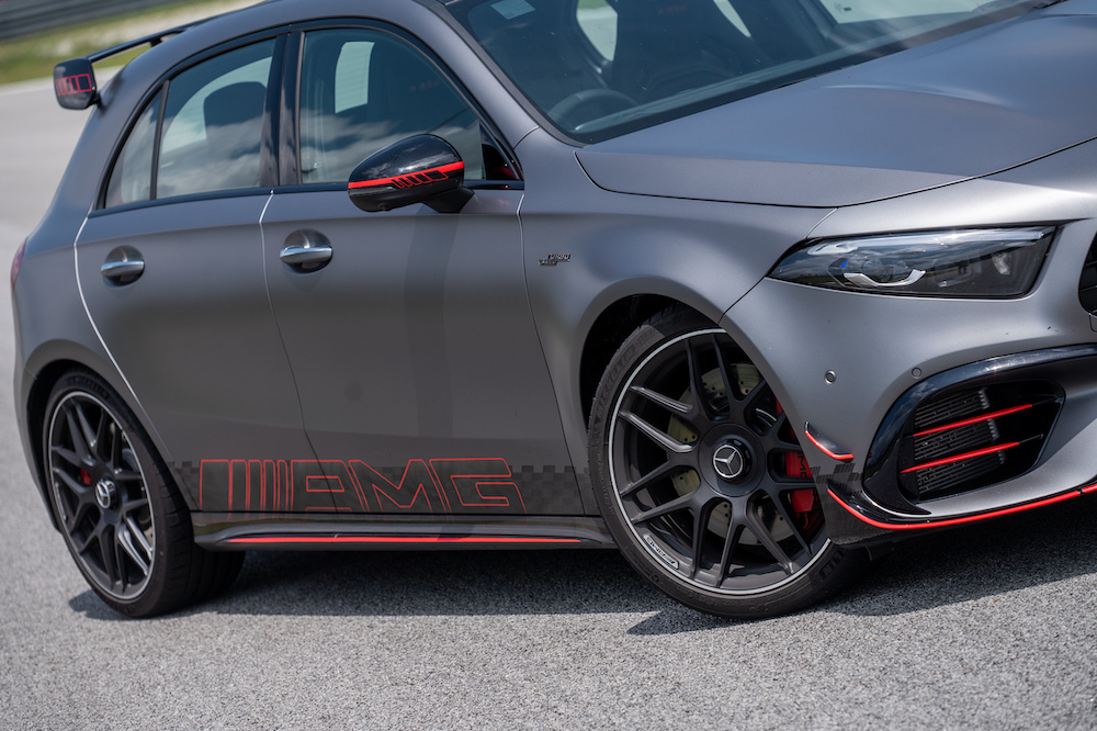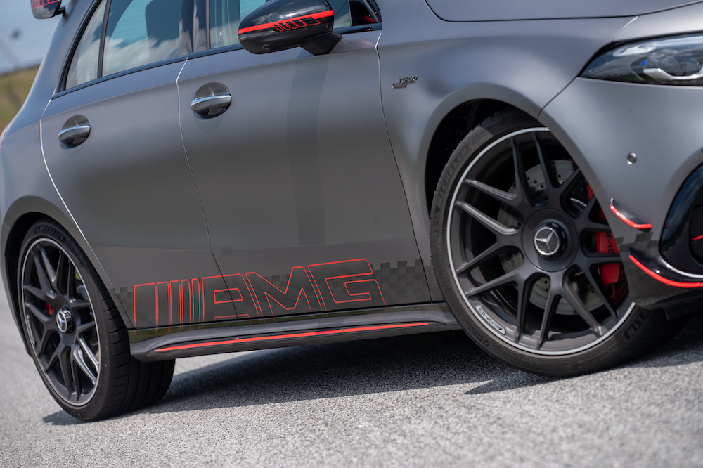 For a limited time, the AMG Street Style Edition is available for the Mercedes-AMG A 45 S 4MATIC+. With the base paint in MANUFAKTUR mountain grey MAGNO and the edition-specific foiling with the colour gradient in black/anthracite matt and colour accents in fluorescent orange, it emphasises the elements of the Aerodynamics Package. The look is perfectly complemented by the newly designed 19-inch AMG cross-spoke forged wheels. The AMG Street Style Edition is also equipped with an AMG-specific radiator grille, darkened, Edition decals and a Model badge on the boot lid and wings in high-gloss black.