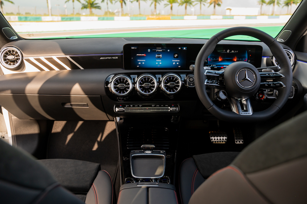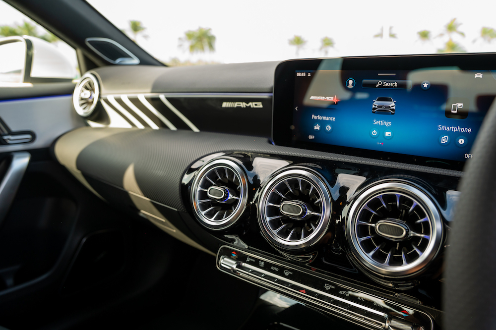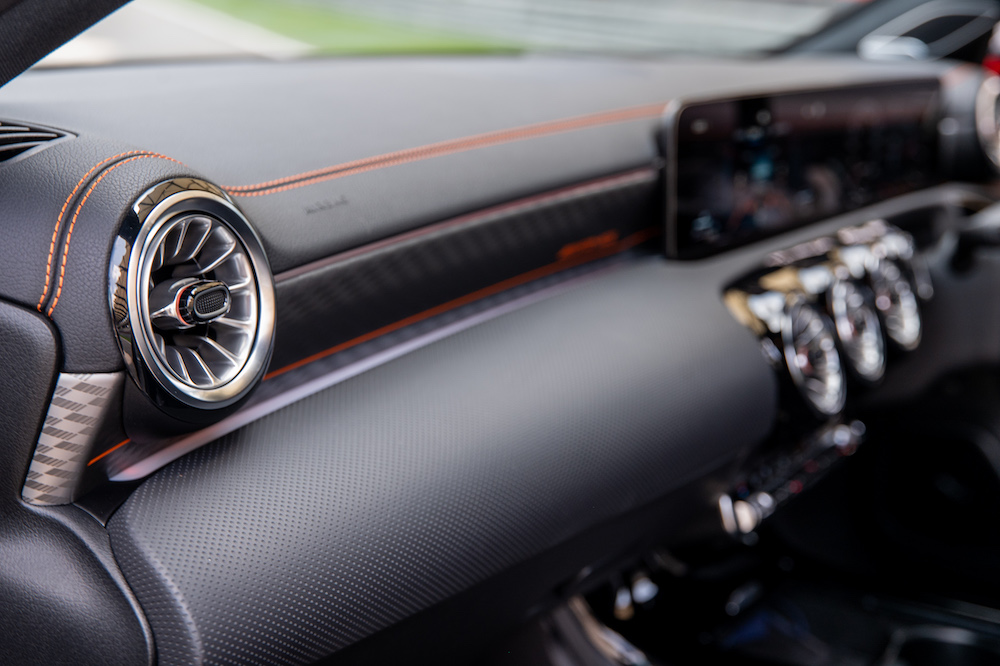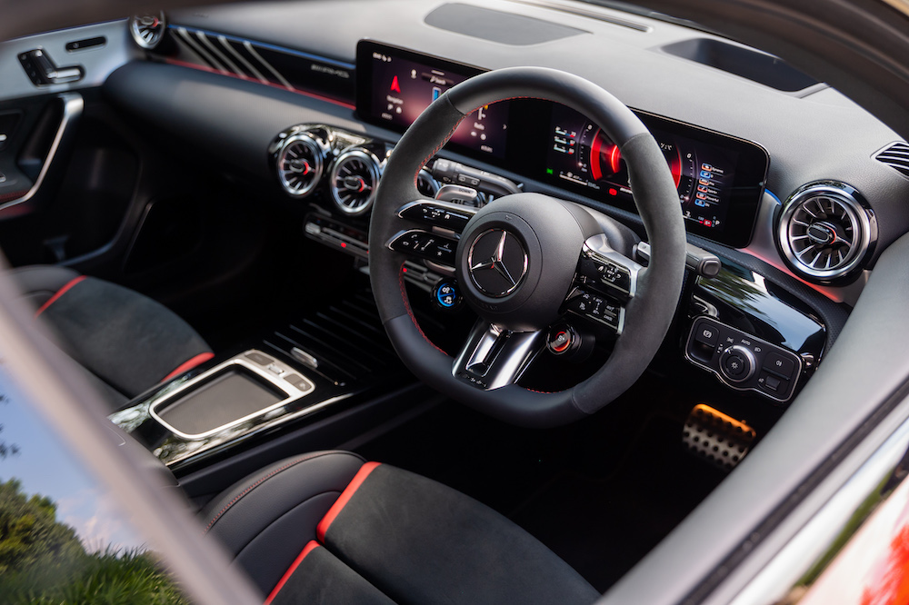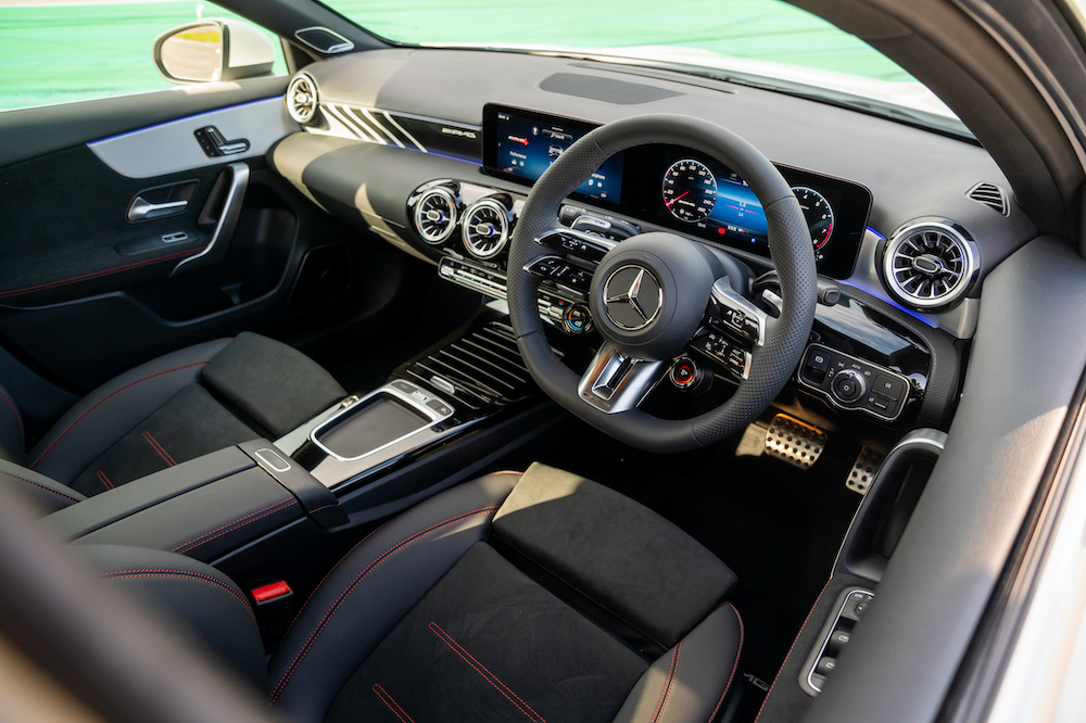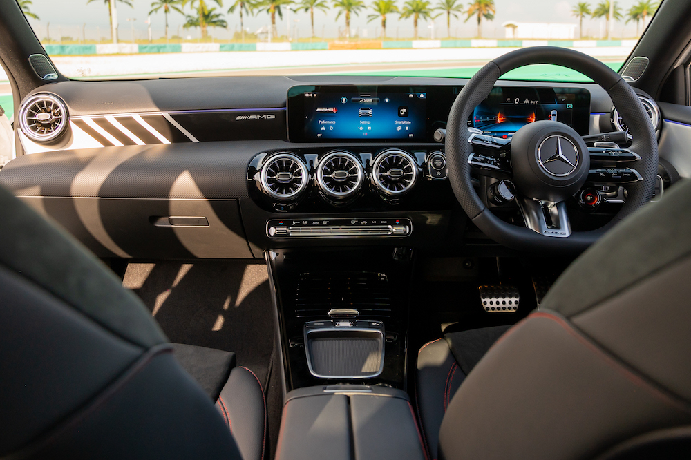 The AMG A 45 S 4MATIC+’s new version of the steering wheel with new touch-control panels, providing enhanced functionality and convenience is wrapped in Nappa leather / MICROCUT microfiber and the AMG A 35 4MATIC’s is in nappa leather. In addition, the A 45 S 4MATIC+ comes with the Multicontour Seat package paired with AMG Performance Seat Package Advanced and the AMG A 35 4MATIC comes with sport seats.