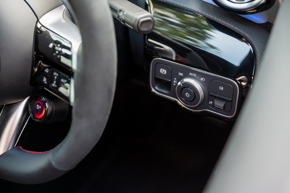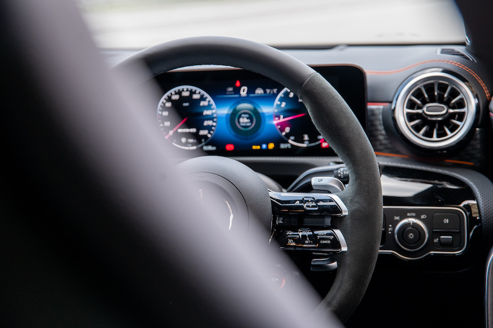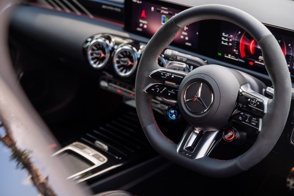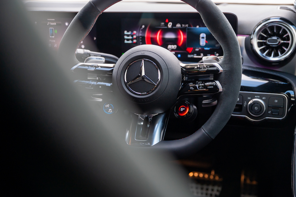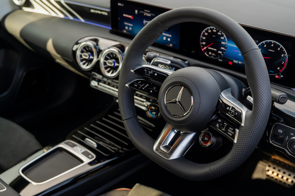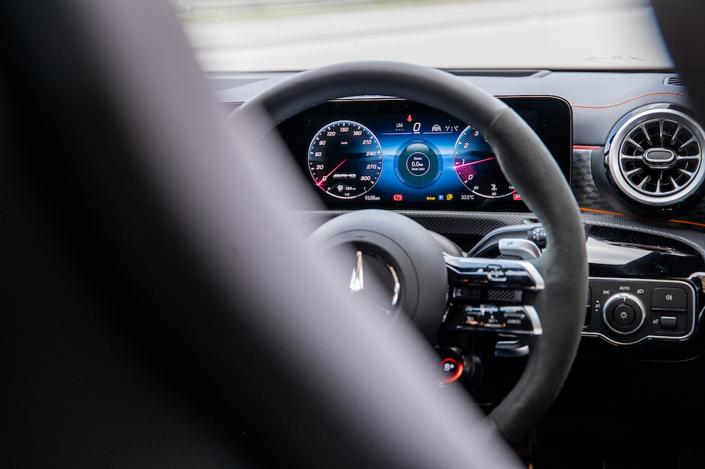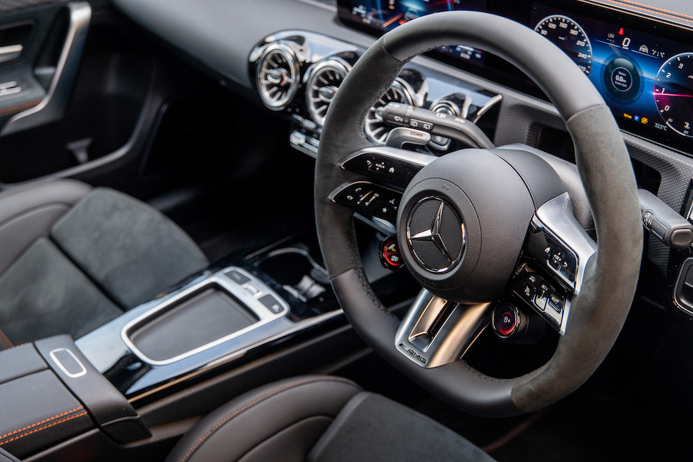 Inside, the AMG Performance steering wheel including AMG steering wheel buttons comes as standard on the new Mercedes-AMG A-Class models. AMG Dynamic Select is available on the steering wheel, so you don’t have to take your hands off the wheel to change modes.