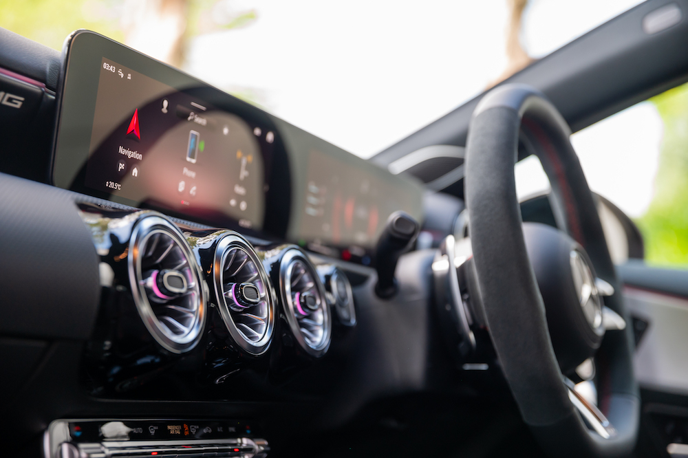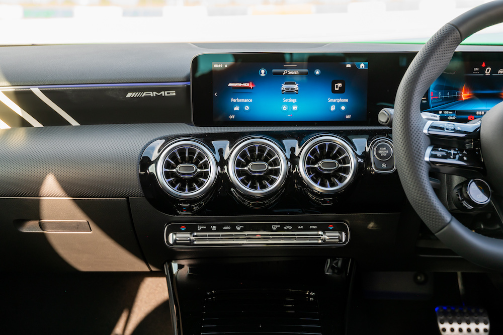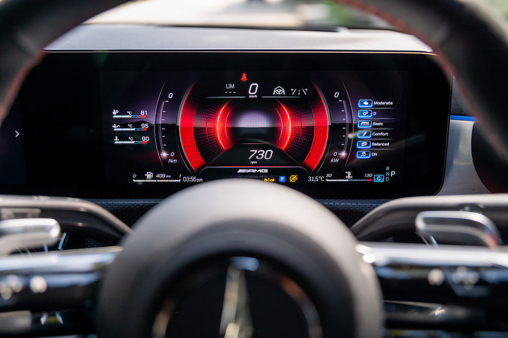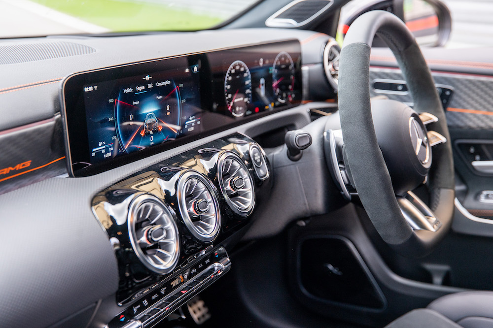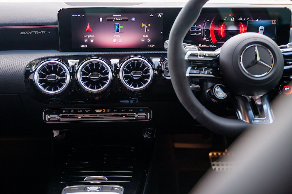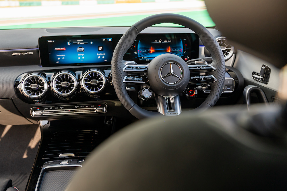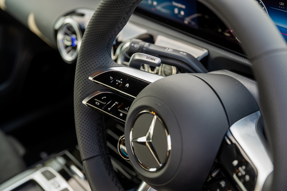 Inside, the AMG Performance steering wheel including AMG steering wheel buttons comes as standard on the new Mercedes-AMG A-Class models. AMG Dynamic Select is available on the steering wheel, so you don’t have to take your hands off the wheel to change modes.