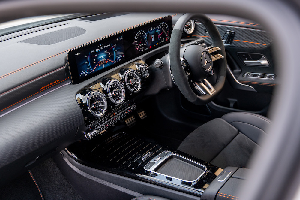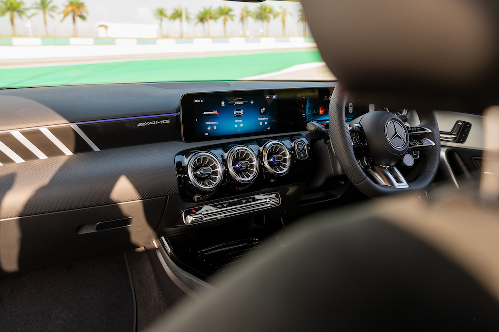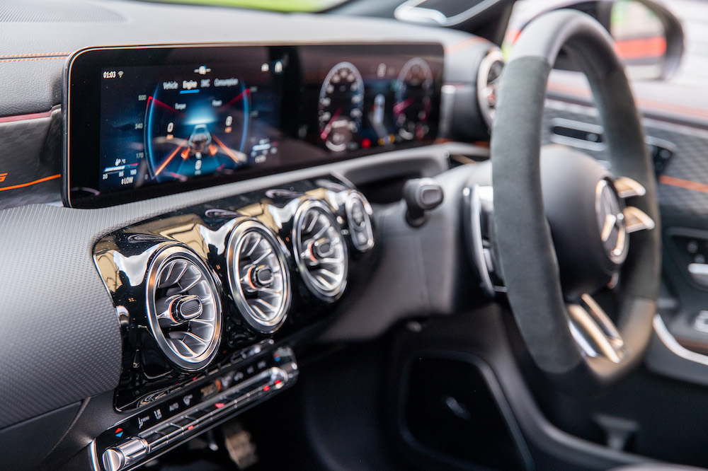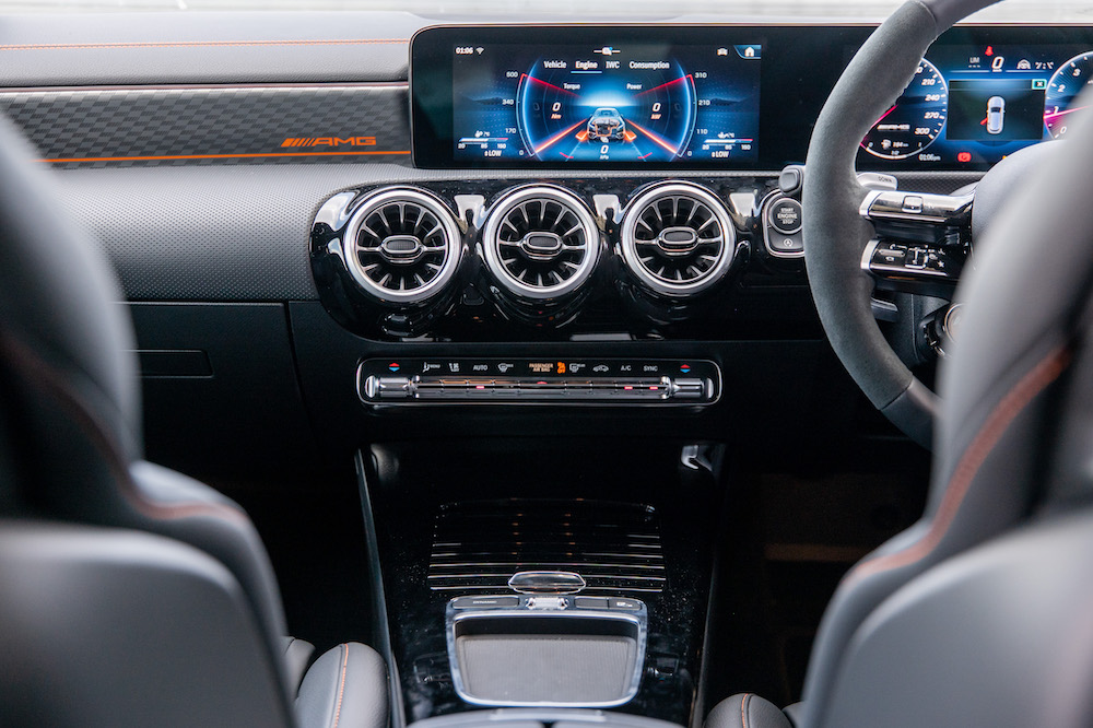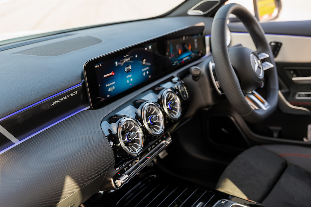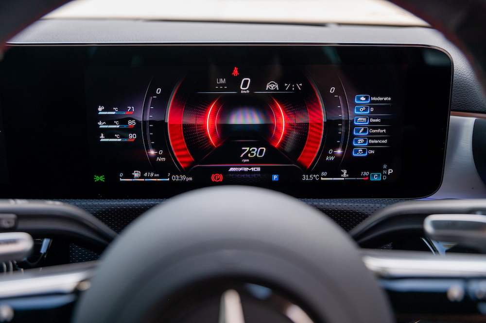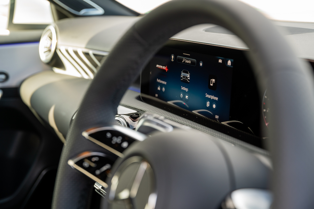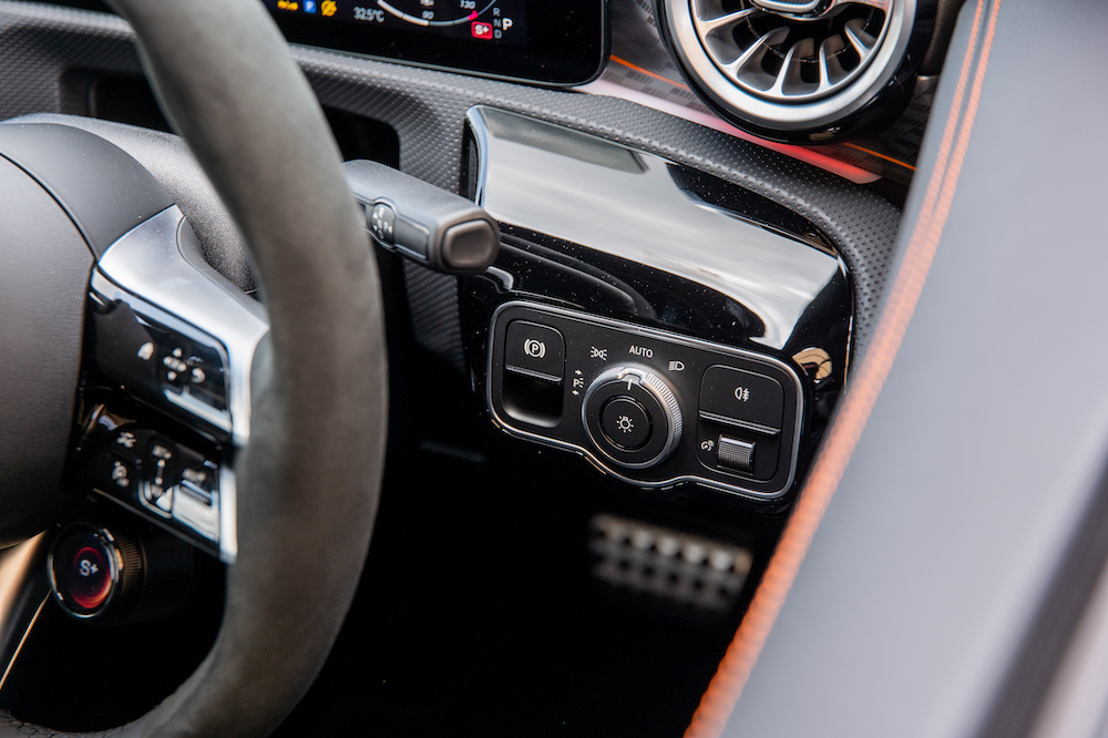 Inside, the AMG Performance steering wheel including AMG steering wheel buttons comes as standard on the new Mercedes-AMG A-Class models. AMG Dynamic Select is available on the steering wheel, so you don’t have to take your hands off the wheel to change modes.