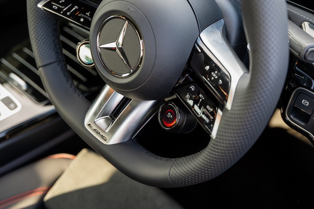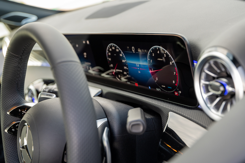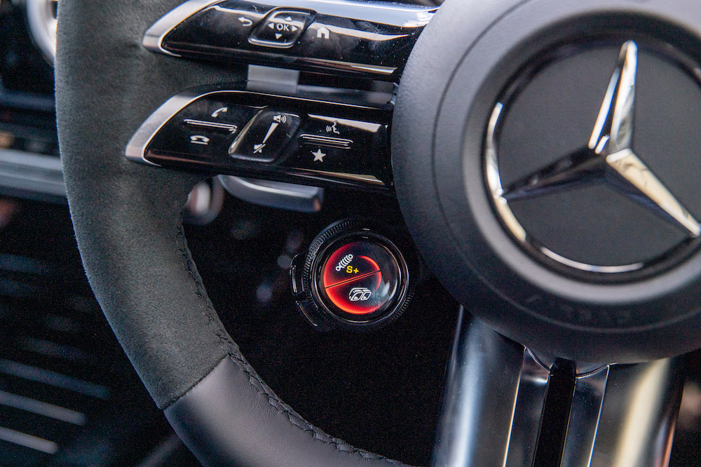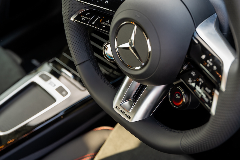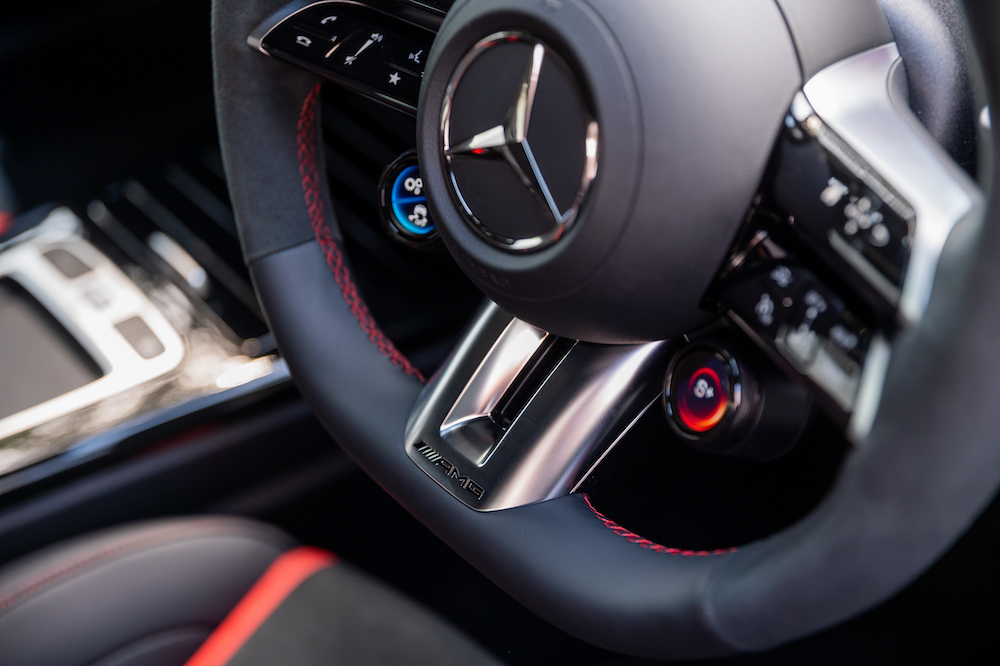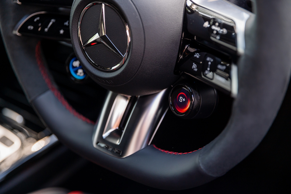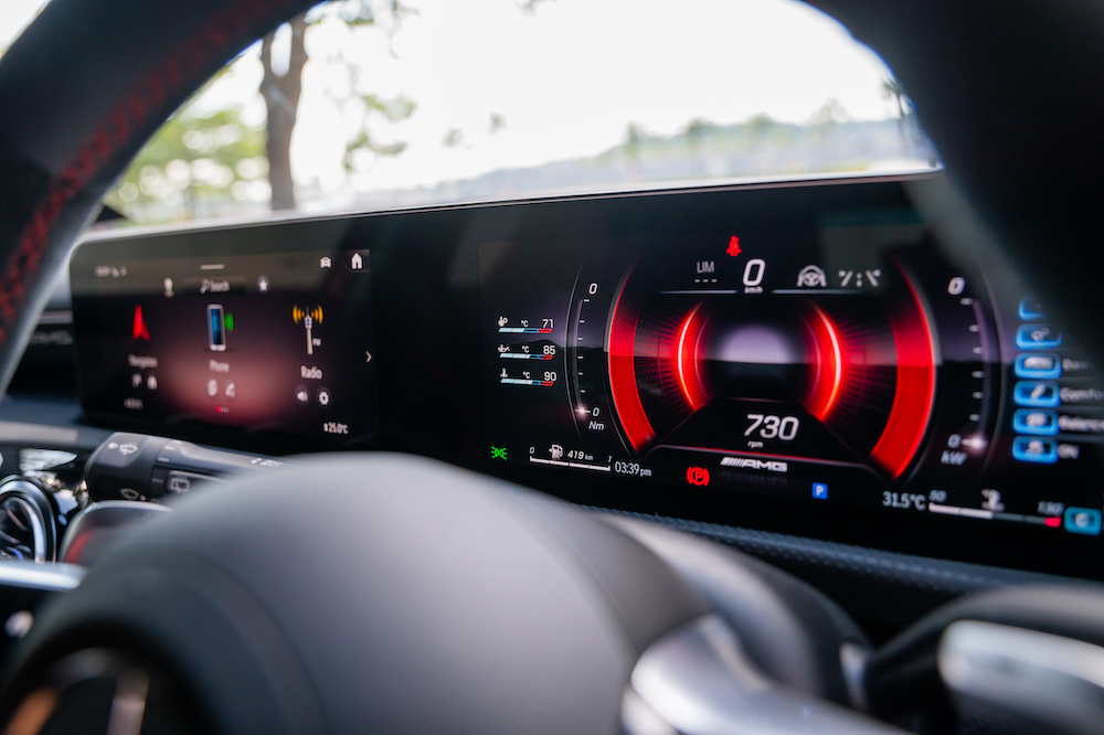 Inside, the AMG Performance steering wheel including AMG steering wheel buttons comes as standard on the new Mercedes-AMG A-Class models. AMG Dynamic Select is available on the steering wheel, so you don’t have to take your hands off the wheel to change modes.