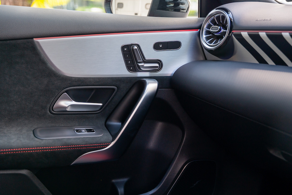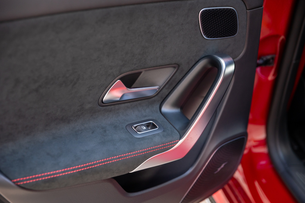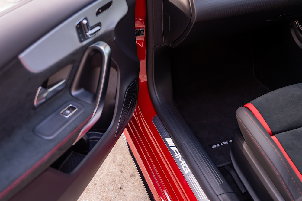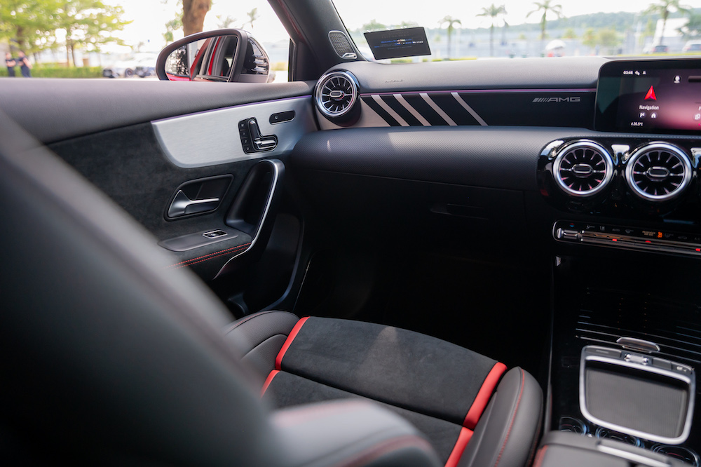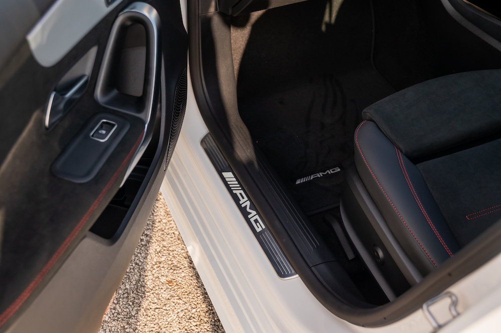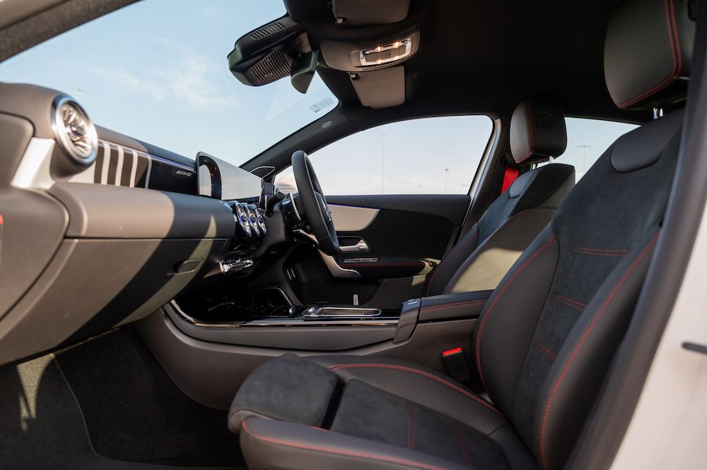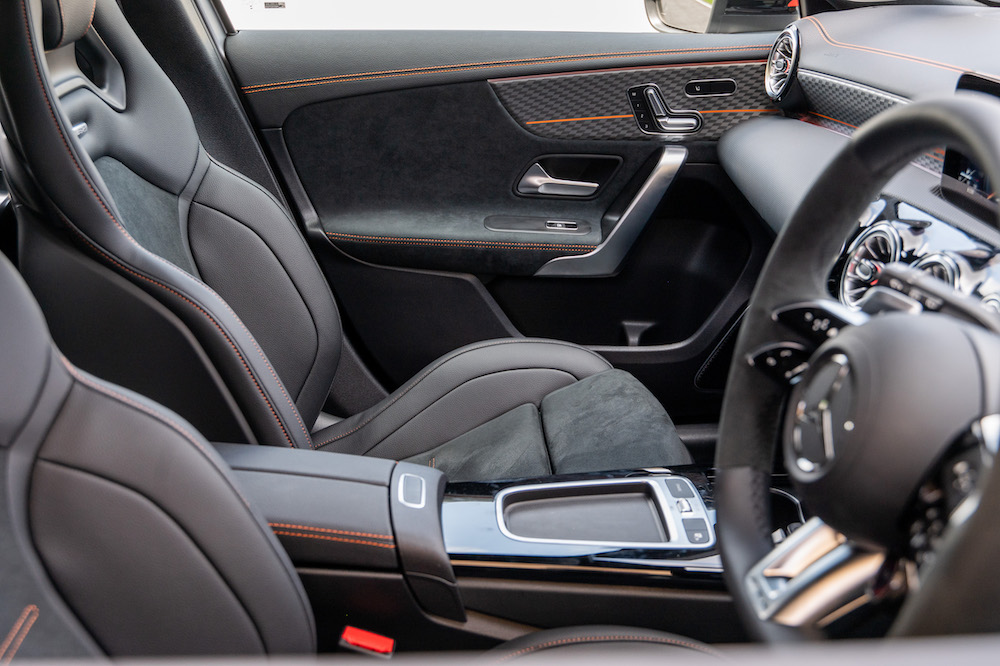 The ARTICO man-made leather / MICROCUT microfibre AMG upholstery with Aluminium AMG Design trim elements in black / silver comes as standard in both the AMG A 45 S 4MATIC+ and AMG A 35 4MATIC. Both models include MANUFAKTUR seat belts in red, AMG floor mats, ambient lighting in 64 colours, and AMG illuminated door sills with “AMG” lettering and an exchangeable cover which further elevates the sportiness of the vehicle.