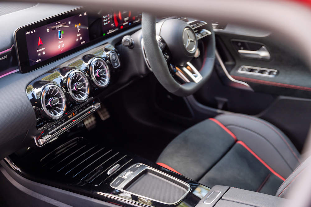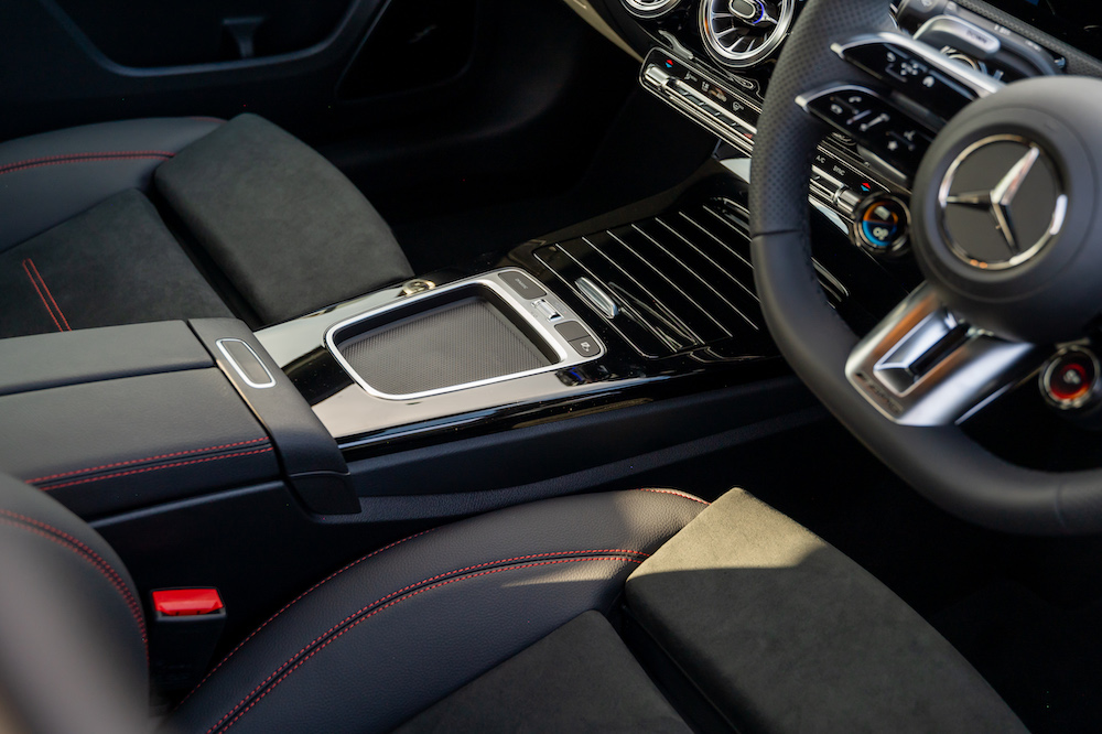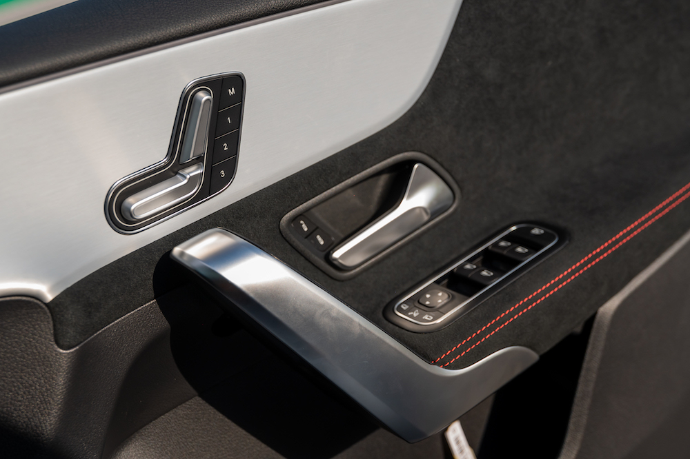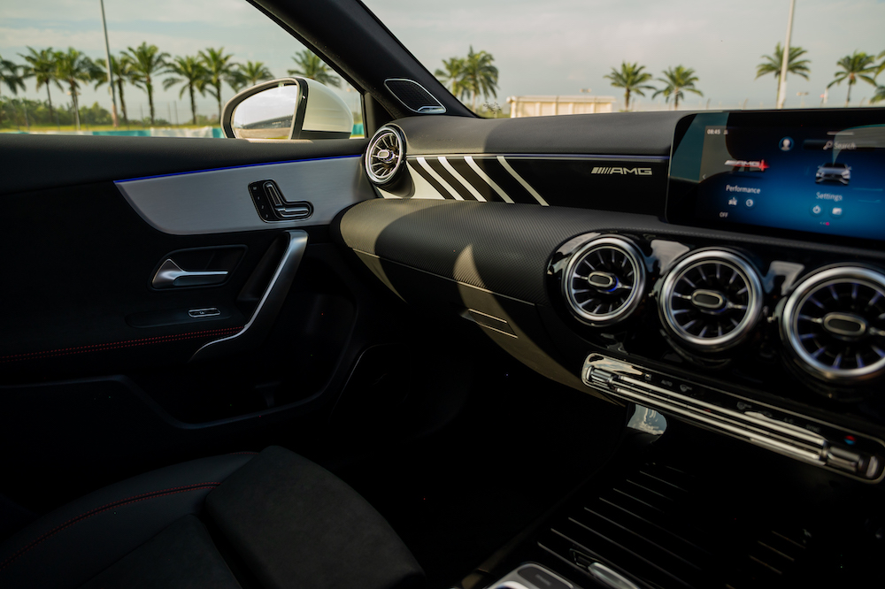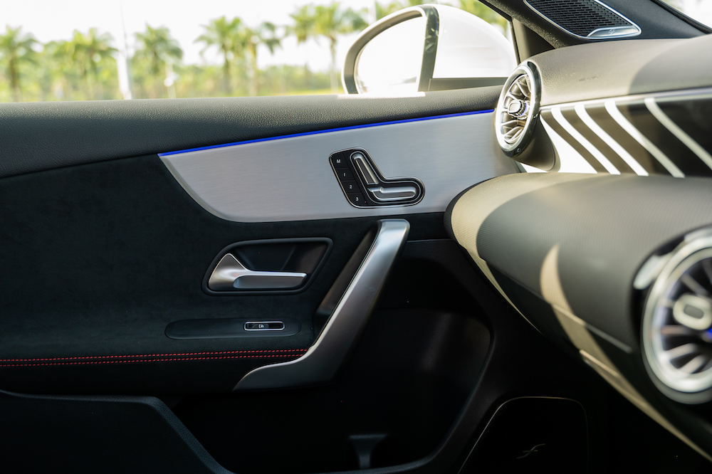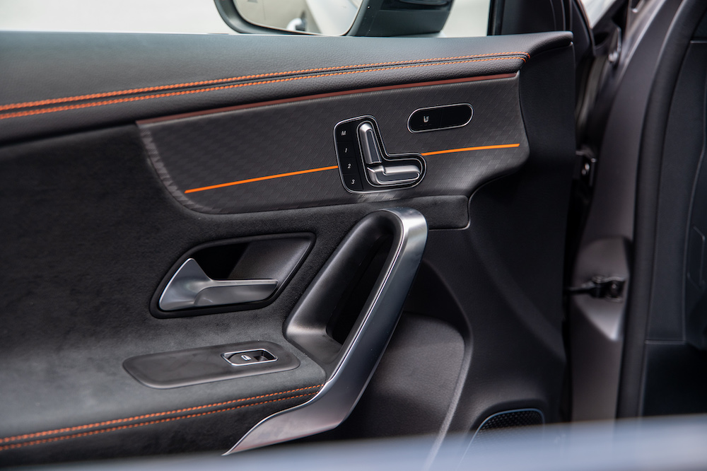 The ARTICO man-made leather / MICROCUT microfibre AMG upholstery with Aluminium AMG Design trim elements in black / silver comes as standard in both the AMG A 45 S 4MATIC+ and AMG A 35 4MATIC. Both models include MANUFAKTUR seat belts in red, AMG floor mats, ambient lighting in 64 colours, and AMG illuminated door sills with “AMG” lettering and an exchangeable cover which further elevates the sportiness of the vehicle.