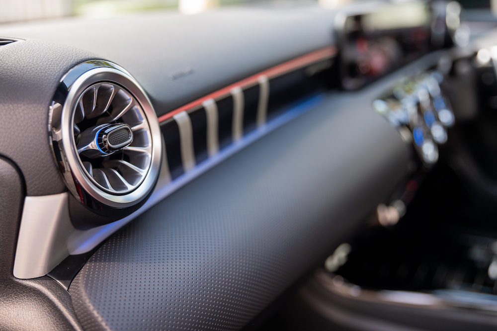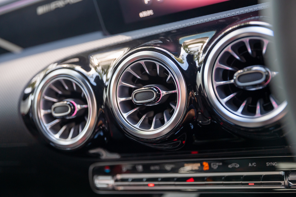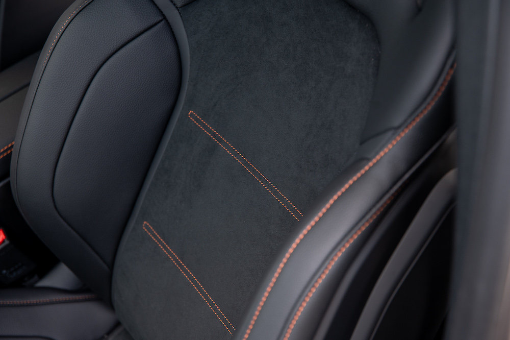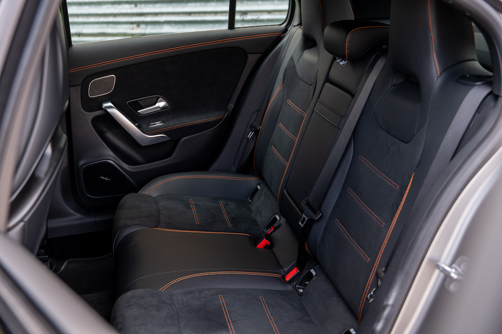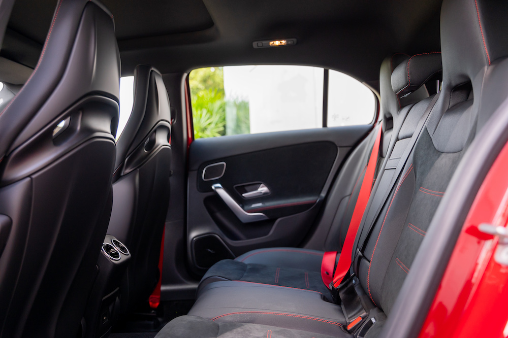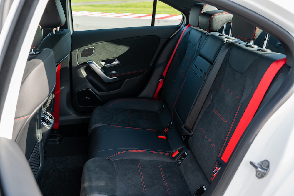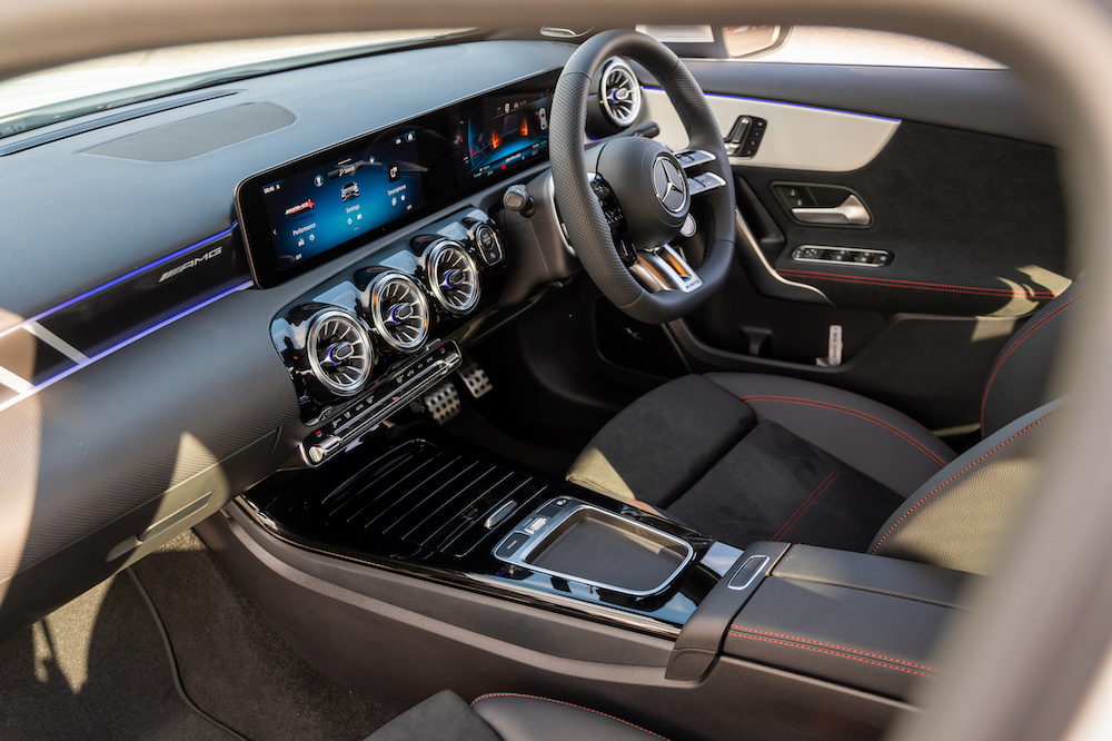 The ARTICO man-made leather / MICROCUT microfibre AMG upholstery with Aluminium AMG Design trim elements in black / silver comes as standard in both the AMG A 45 S 4MATIC+ and AMG A 35 4MATIC. Both models include MANUFAKTUR seat belts in red, AMG floor mats, ambient lighting in 64 colours, and AMG illuminated door sills with “AMG” lettering and an exchangeable cover which further elevates the sportiness of the vehicle.
