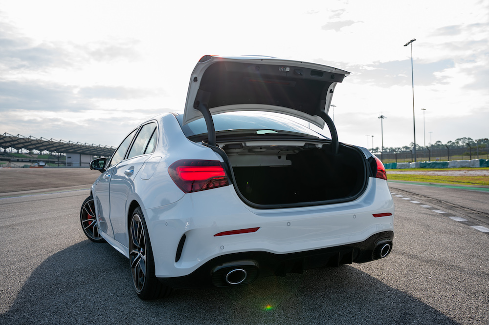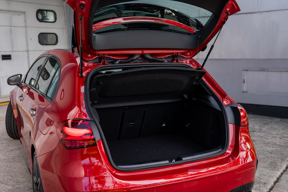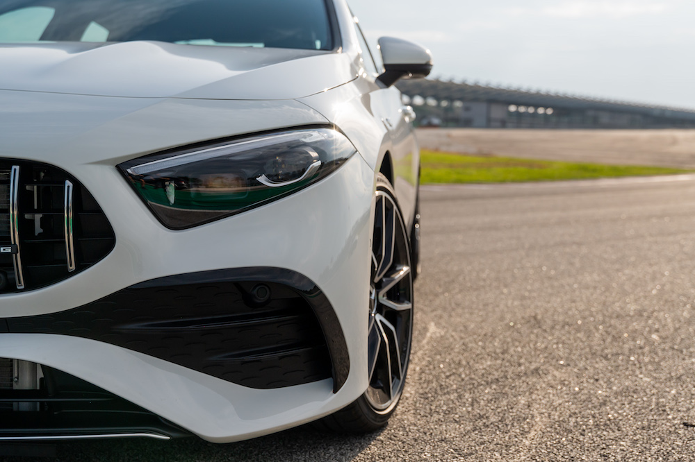 The Mercedes-AMG A 35 is now equipped with a 48-volt auxiliary power supply and belt-driven starter-generator (RSG) and achieves an output of 225 kW/306hp with a maximum torque of 400Nm. As a mild hybrid, the RSG supports agility with 10 kW more power at start-up. In addition, an AMG SPEEDSHIFT DCT 8-speed transmission is now on board and the new front radiator facilitates temperature management at the limit.