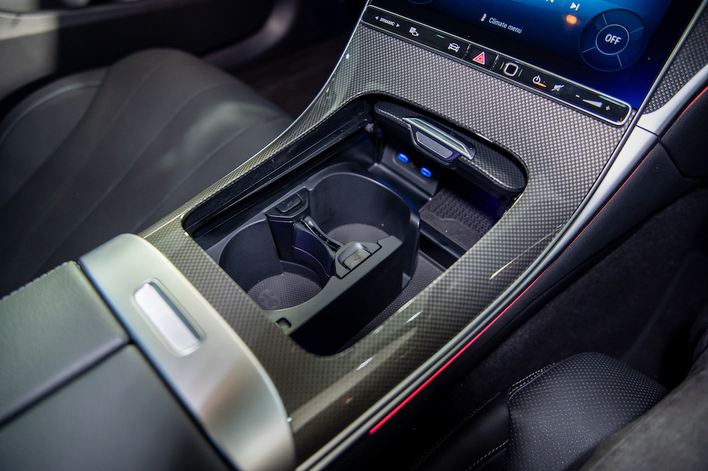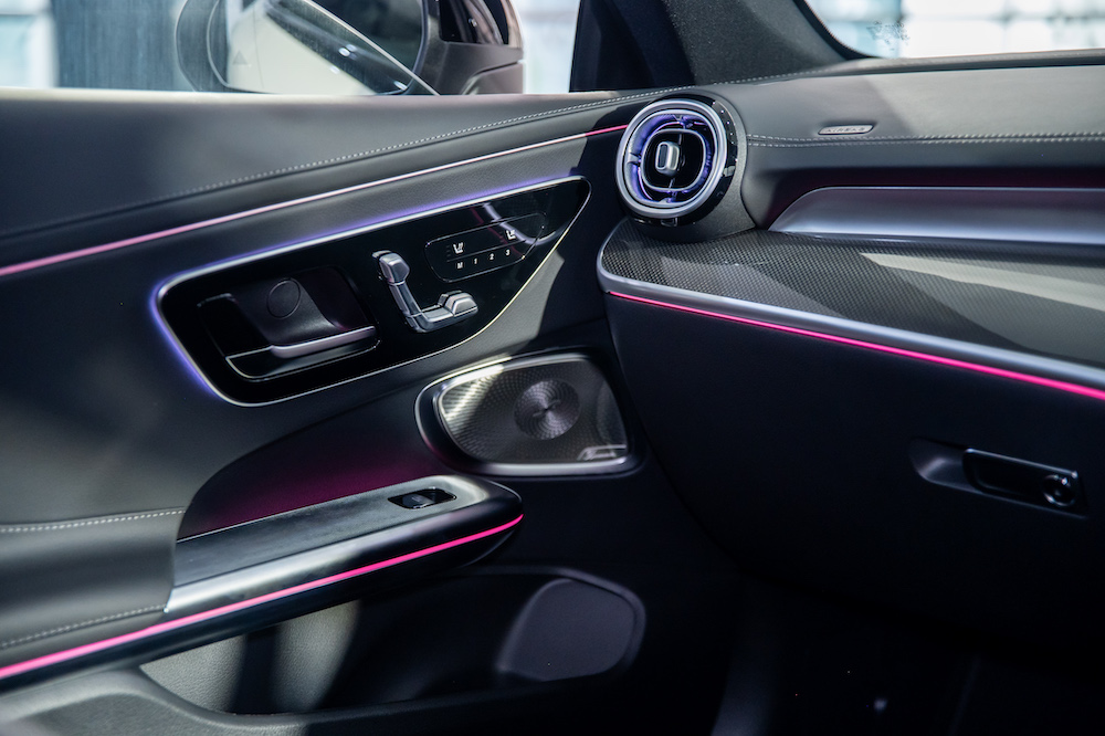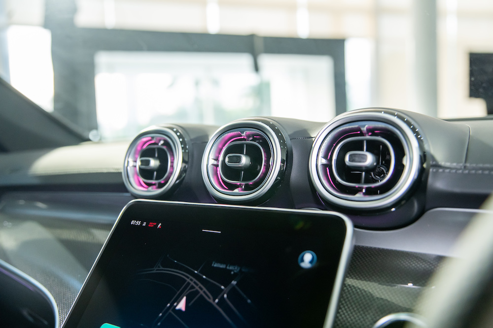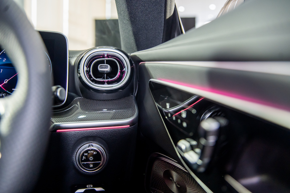 Additional sportiness is created by the dynamic ambient lighting in 64 colours. Ambient lighting with indirect light on the trim strip of the instrument panel, the cup holders on the centre console, the overhead control unit, the door handles, the seat adjustment unit and in the front footwell is included. For further convenience, the KEYLESS-GO Comfort Package, HANDS-FREE ACCESS, Mirror Package, and head-up display are also included. THERMATIC automatic climate control allows the driver and front passenger to set the temperature separately for their side.