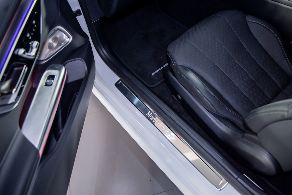 The AMG line exterior comes with Night Package showcasing expressive black design elements which enhances the vehicle on the outside. These include the exterior mirror housings, beltline trim strips and side window surrounds. Tinted windows and 19-inch AMG multi-spoke light-alloy wheels complete the sporty, individual appearance. The vehicle comes with a panoramic sliding sunroof, Driving Assistance Package Plus, ambient lighting with projection of brand logo, and Adaptive Highbeam Assist Plus.