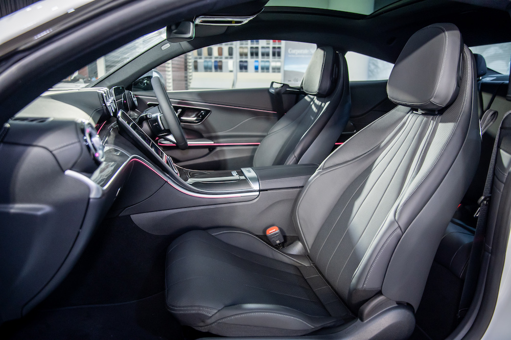 Other highlights include the multi-function sports steering wheel in nappa leather and new front seats developed exclusively for the CLE. They feature an avant-garde sports seat design with integrated headrests in leather upholstery. The sporty integral seat look of the new multi-contour seats reinforces the reduced design with three-dimensional, seamless shapes on the instrument panel and in the doors – giving the interior an additional visual lightness. The front seats include climatised front seats with seat heating and seat ventilation and an electro-pneumatic four-way lumbar support. The memory function can be used to save individual driver seat settings for up to three people.
