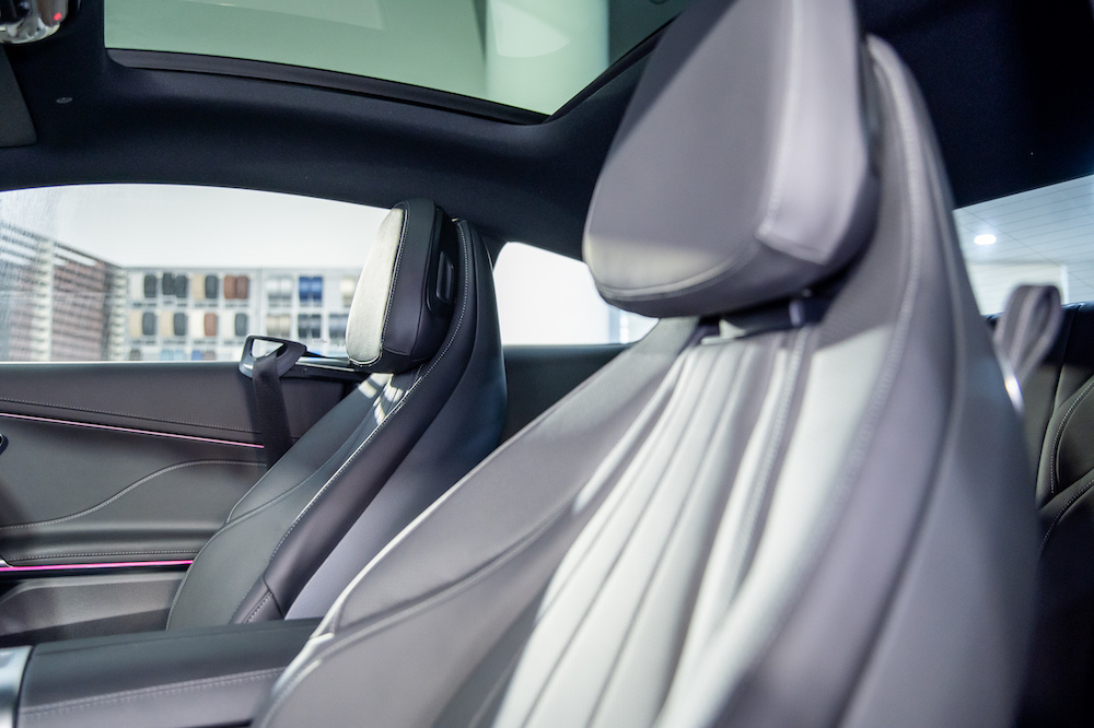 A new, EASY-ENTRY function ensures easy access to the rear. The front seats are not unlocked with a lever, but with an elegant loop made of Nappa leather. It is conveniently located at the upper edge of the backrest. Anyone who has not buckled their seat belt immediately after boarding can reactivate the seat belt feeder via a button on the central display or simply by opening and closing the door again. In addition, the CLE Coupé is one of the first Mercedes-Benz vehicles with an optimised warning if the seat belt is not fastened. The system only reacts to seats on which someone who has not buckled their seat belt is actually sitting.