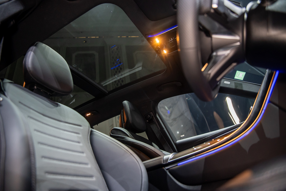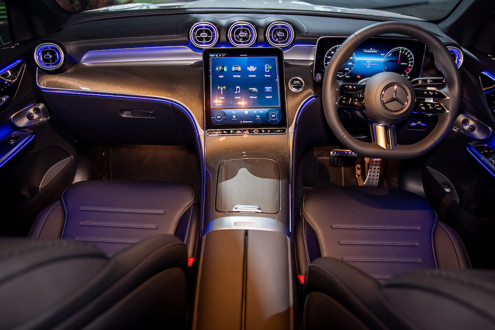 Inside, the GLC 350 e 4MATIC exudes sportiness and luxury, courtesy of its AMG Line interior. The cabin features black ARTICO man-made leather, MICROCUT microfiber, AMG sports pedals, and a multifunction sports steering wheel in nappa leather with a flat-bottom design.