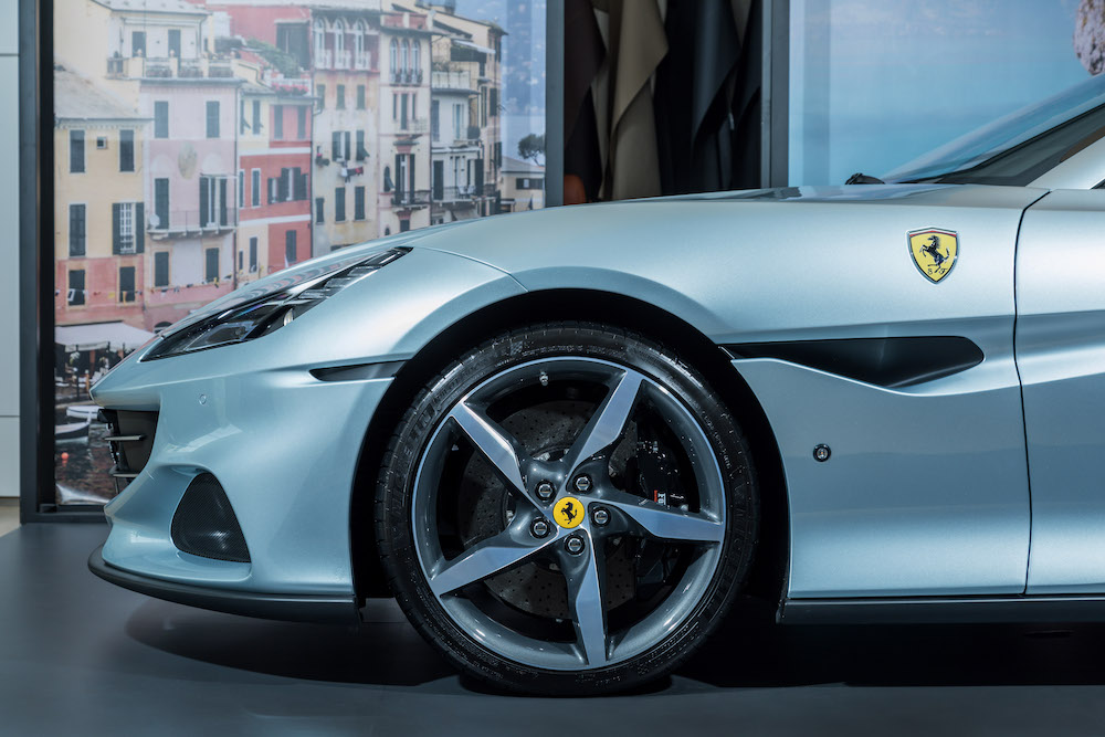 Specific diamond-finish wheel rims were designed for the Ferrari Portofino M. The unusually sculptural design of the spokes and their chiaroscuro look visually lightens the rim. Simply put, the entire car looks stunning.