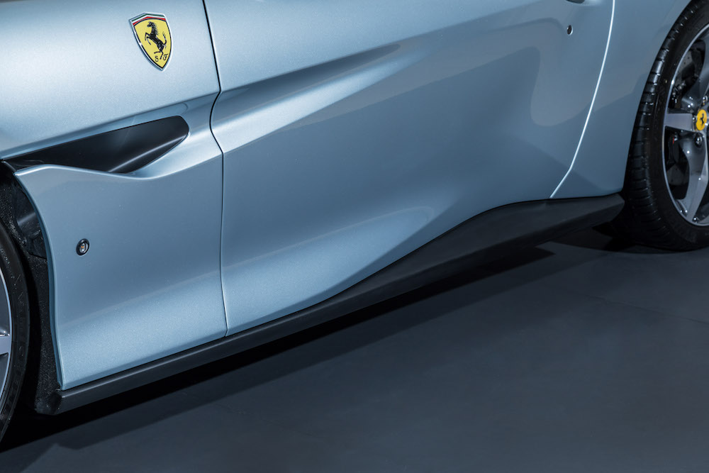 Part of the airflow coming off the front radiating masses is directed towards the new vents and then accelerated up as it exits, boosting its extraction power. The resulting improvement in aerodynamic performance is underscored by a slash on the front bumper that flows into the design of the flanks. As a result of the front bumper’s slash, the signature Portofino side scallop finds its visual counterpart on the Ferrari Portofino M’s front bumper.