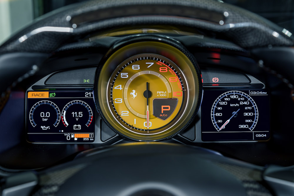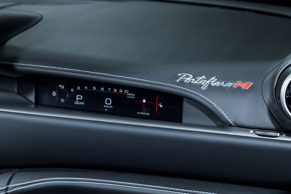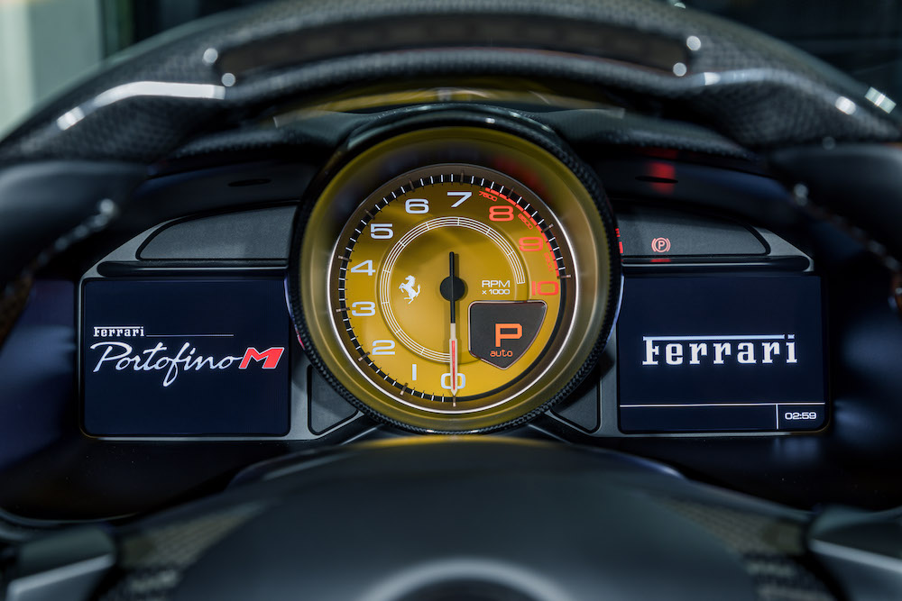 The Ferrari Portofino M’s HMI (Human-Machine Interface) centres on a digital cluster with dual TFT displays arranged around the analogue rev counter in a generous circular, anti-glare binnacle. Located on exactly the same axis as the multifunctional steering wheel, the driver can easily and intuitively interact with the car.