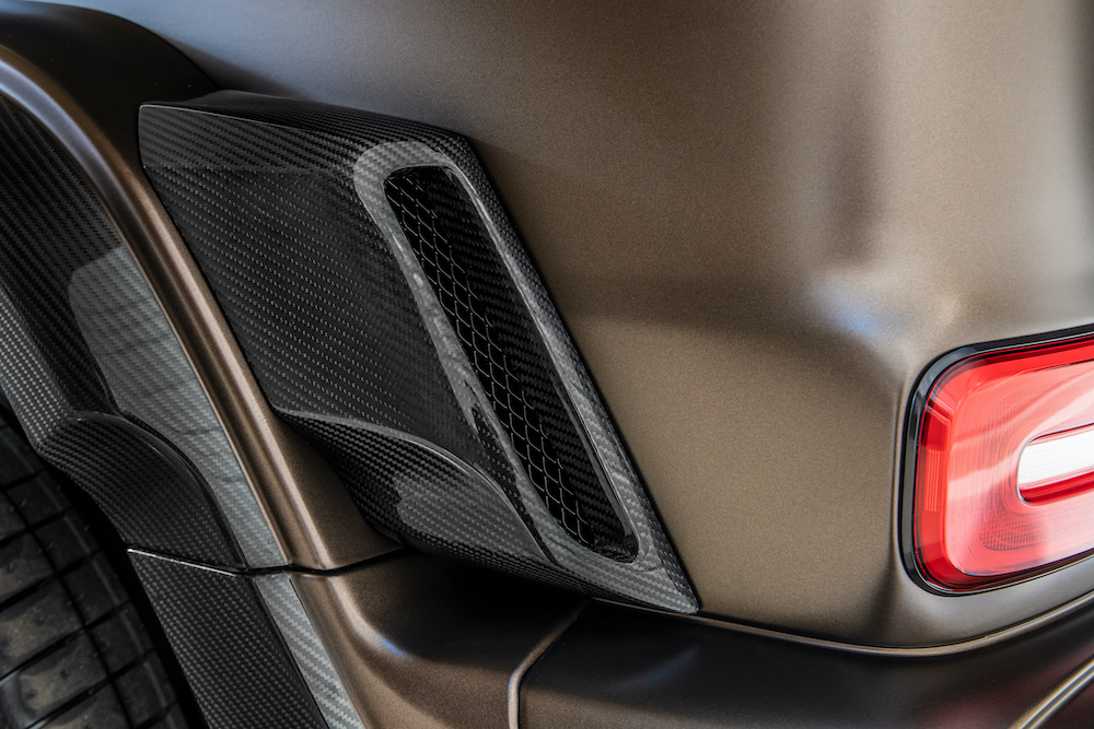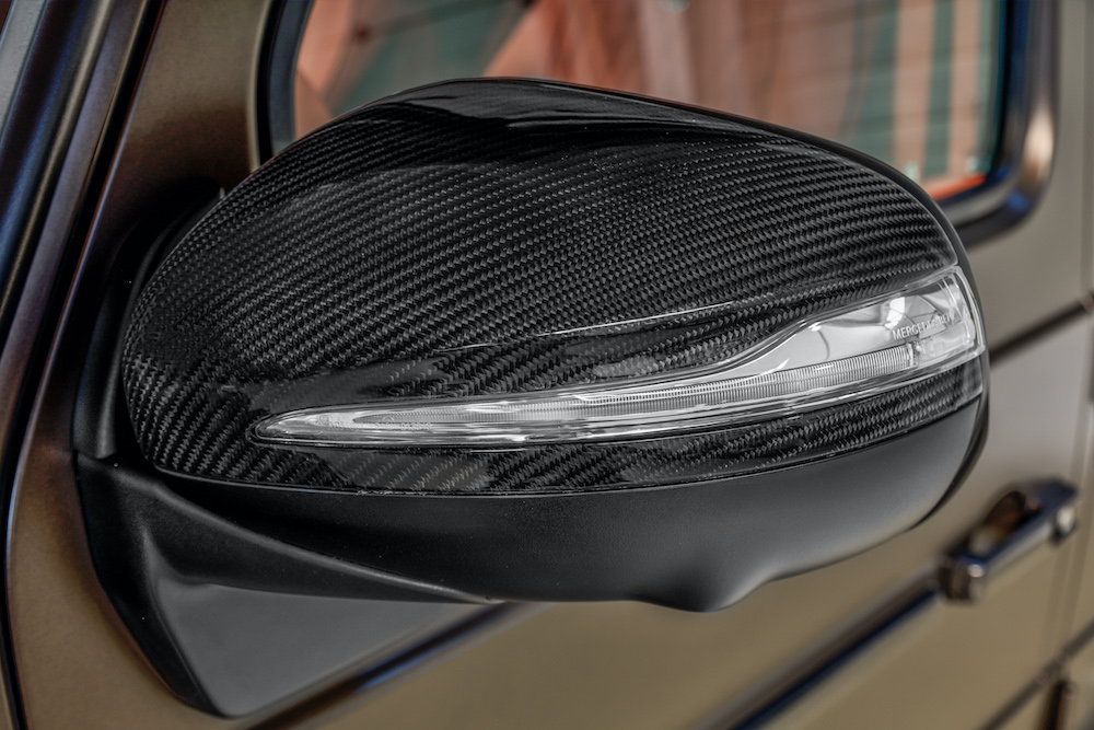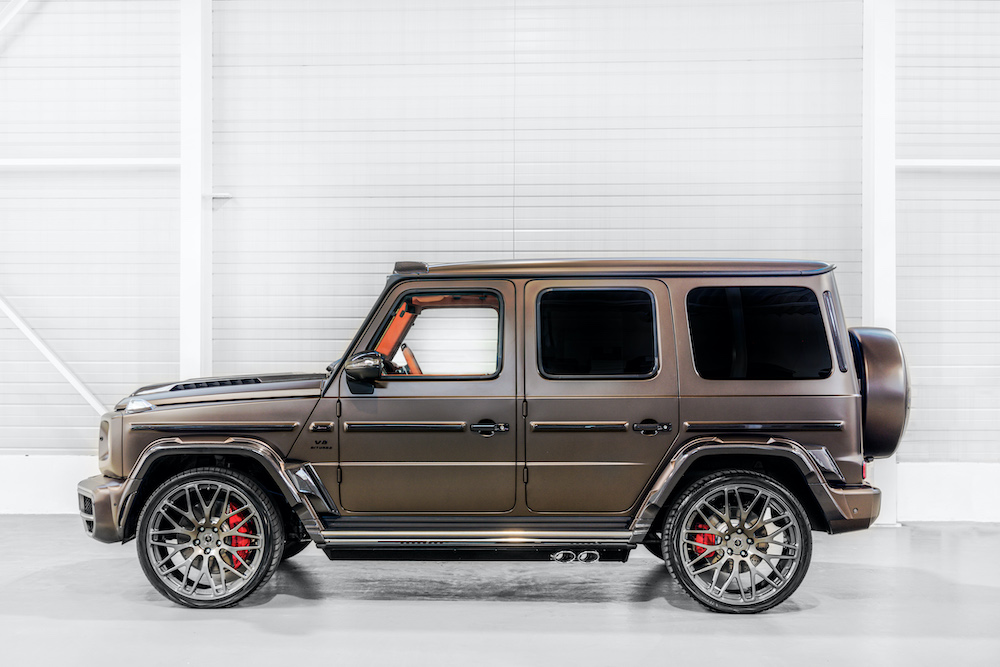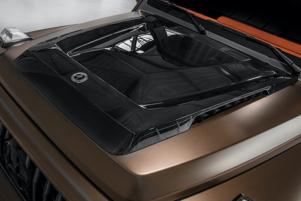 Transforming the G 63 into the HG 63 ‘Limitless’ starts with the HOFELE wide-arch exterior styling package. Following that, the HOFELE redesigned front bumper finished with high gloss Carbon trim is added to the mix. The addition of the new HOFELE bespoke bonnet ‘Power Dome’ and wheel arch mounted side vents are seen here for the first time. The exterior paint finish is the G ‘Manufaktur Citrine Brown Magno’, which is already a bold statement, looks stunning with the contrasting gloss Carbon styling enhancements.