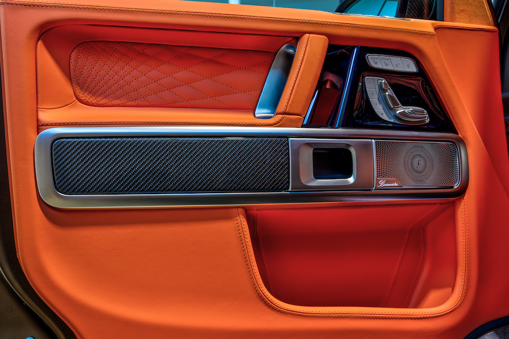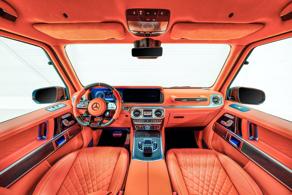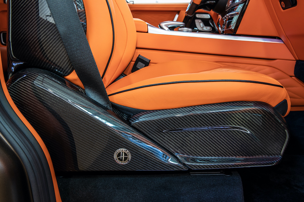 The interior is where the owner of this unique Hofele G 63 really shows off his style. He chose the “HOFELE Mandarin Orange” for the fully trimmed Nappa leather and Alcantara interior. The one-of-a-kind stitching and perforation pattern is the latest variation of the original HOFELE de-signs. Extensive use of quality high gloss Carbon trim can be seen throughout and continues the theme of Carbon elements of the exterior.