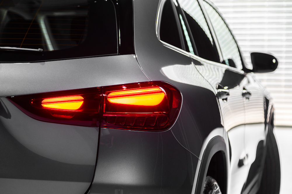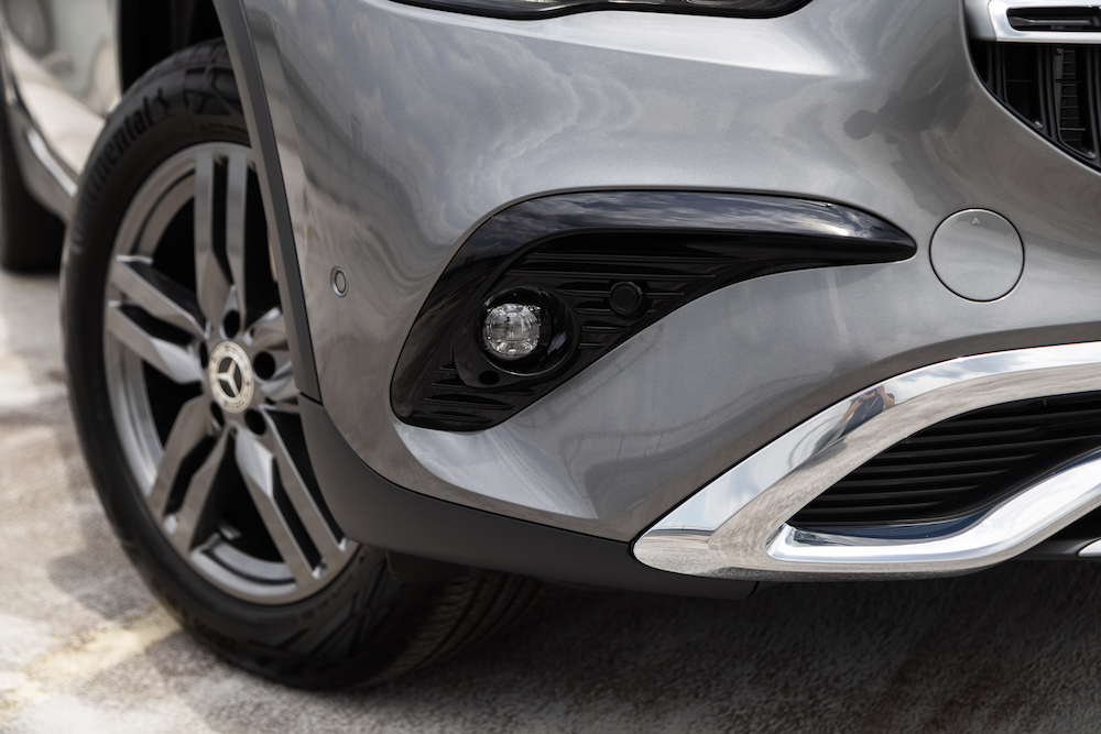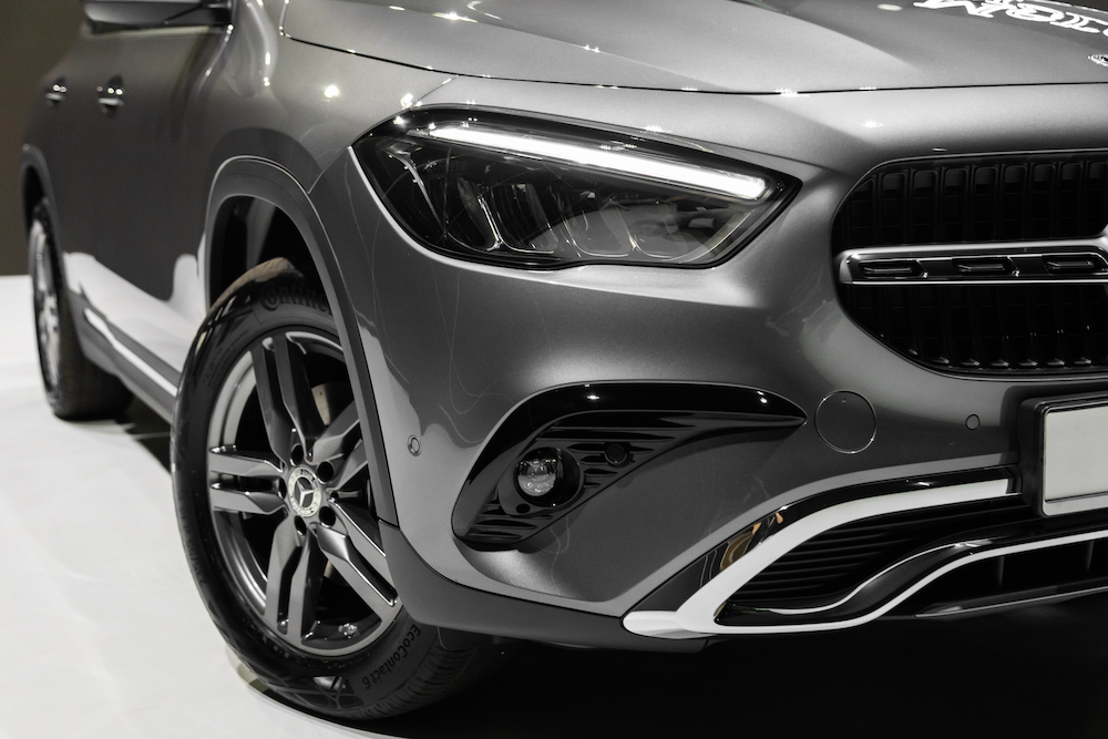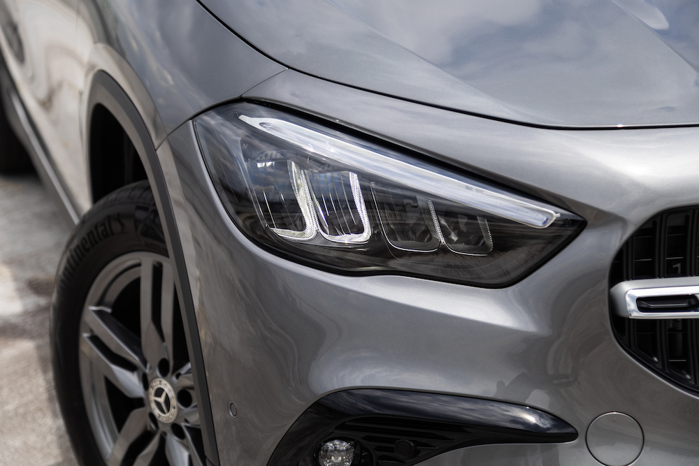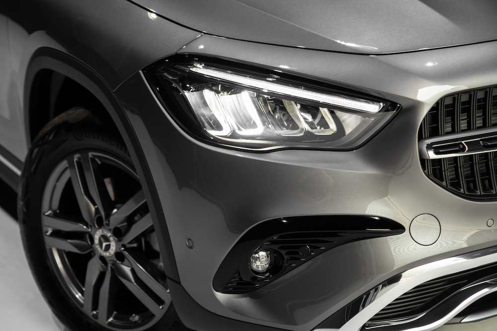 The new GLA has a modernised light signature featuring powerful LED High Performance front headlamps equipped with Adaptive Highbeam Assist and LED rear lights. The headlamps illuminate the road with a wide beam and pleasant warm-white light much more precisely and generously. Front fog lamps spread the light widely and illuminate peripheral areas better for safer driving in difficult conditions. Mercedes-Benz is expanding the range of options with the new Spectral Blue metallic paint finish. The new GLA stands on 18-inch 5-twin-spoke light-alloy wheels, aerodynamically optimised, painted in tremolite grey with a high-sheen finish.